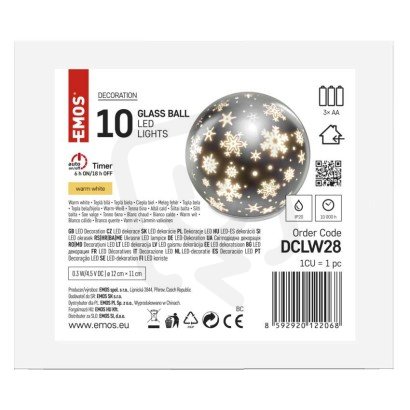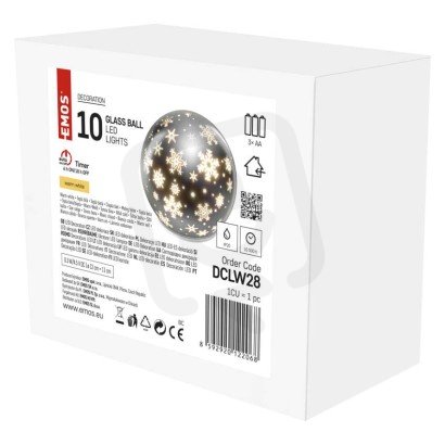 10LED GLASS BALL 3AA WW T najdete v kategoriích Svítidla, Vánoční, dekorativní a párty osvětlení, Svítidla, světelné zdroje a LED osvětlení, výrobce Emos, EAN 8592920122068, kód dodavatele DCLW28. LED vánoční skleněná koule - vločky 12 cm 3x AA vnitřní teplá bílá časovač nabízíme od 1 ks. Kód EMAS 10LED GLASS BALL 3AA WW T je ELSVOS1445960.