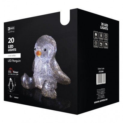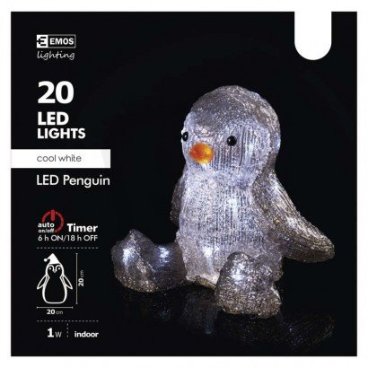 LED vánoční tučňák, 20cm, 3× AA, vnitřní, studená bílá, s časovačem Emos