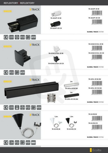 3-fázové lišta modulového systému TRACK o délce 2m. Z jednotlivých komponentů lze vytvořit efektivní osvětlovací soustavu s našimi LED reflektory TR-TL.