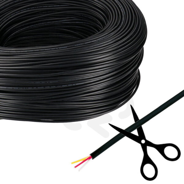 3-žilový kulatý kabel s vodiči 3x0,52mm2, barva vnitřních vodičů červená/bílá/žlutá, vnější černý PVC plášť, vnější průměr cca 4,8mm. Kabel obsahuje tři měděné lanované vodiče o průřezu 0,52mm2. Používá se k připojování a propojování double white (CCT) LED pásků i ve venkovním prostředí. Při zapojení volte délku a průřez vodiče s ohledem na přípustný úbytek napětí, který na vodiči vzniká průchodem proudu. Balení 200m, prodej po metrech.