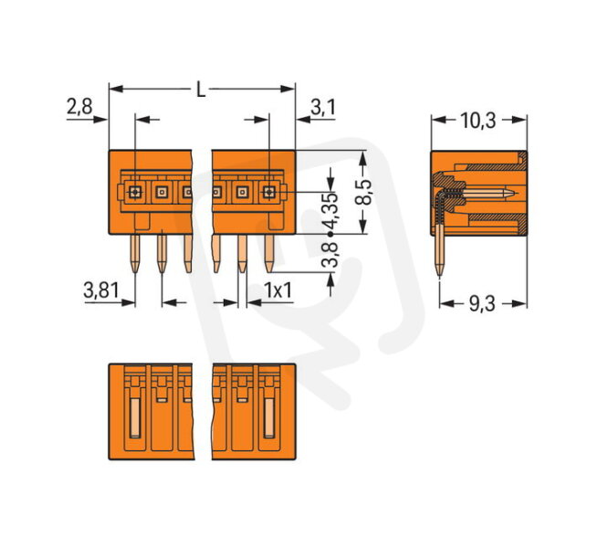 Konektor s pájecími piny THT, pájecí kontakt 1,0x1,0 mm, úhlové, oranžová 15pól.