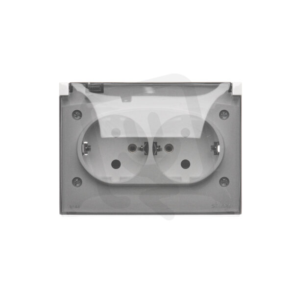 Dvojitá kompaktní zásuvka s uzemněním, Schuko, IP44 - průhledná klapka bílá