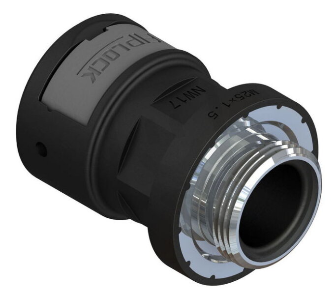 FIPLOCK®ONE přímé připojovací šroubení ASPA-MMK s metrickým kovovým závitem, v krátkém provedení, ze speciálně modifikovaného polyamidu 6, bezhalogenové, je samozhášivé, odolné vůči UV záření a splňuje třídy krytí IP66, IP67, IP68 a IP69, v šedé barvě. 360° aretační systém lze snadno otevřít pomocí běžného plochého šroubováku.