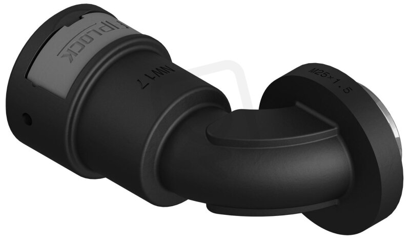 FIPLOCK®ONE připojovací šroubení koleno pro trubku 90° AWPA-MMK s metrickým kovovým závitem, v krátkém provedení, ze speciálně modifikovaného polyamidu 6, bezhalogenové, je samozhášivé, odolné vůči UV záření a splňuje třídy krytí IP66, IP67, IP68 a IP69, v černé barvě. 360° aretační systém lze snadno otevřít pomocí běžného plochého šroubováku.