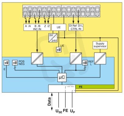 Axioline Smart Elements, Modul snímání pozice, Vstup přírůstkového snímače: 1, symetrické snímače dle EIA-422, Digitální vstupy: 2, 24 V DC, krytí: IP20