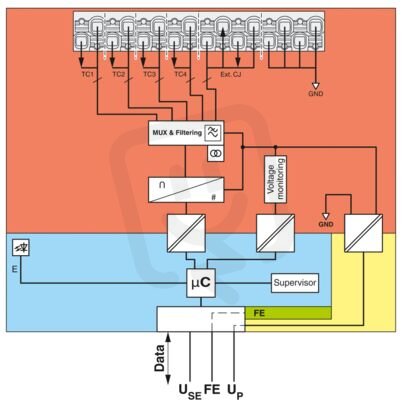 Axioline Smart Elements, Modul snímání teploty, analogové vstupy: 4 (Vstupy pro termočlánky nebo lineární napětí), technologie připojení: 2 vodičové (stíněné, párově kroucené), Externí referenční bod (využitelný i jako dodatečný vstup senzoru Pt 100): 1, technologie připojení: 4 vodič, krytí: IP20