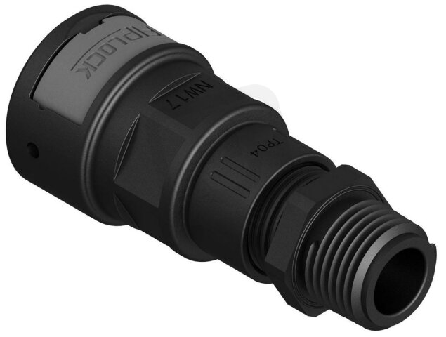 FIPLOCK®ONE přímé připojovací šroubení AZPA-NPT s plastovým závitem NPT a odlehčením v tahu, ze speciálně modifikovaného polyamidu 6, bezhalogenové, je samozhášivé, odolné vůči UV záření a splňuje třídy krytí IP66, IP67, IP68 a IP69, v šedé barvě. 360° aretační systém lze snadno otevřít pomocí běžného plochého šroubováku.