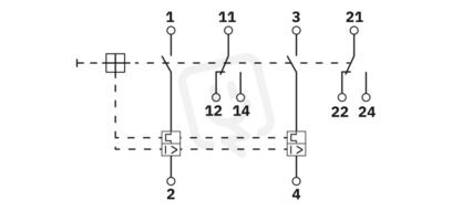 Termomagnetický přístrojový jistič, 2pólový, rozběhová charakteristika M1 (středně pomalá), 2 kontakty přepínače, zástrčka pro základní prvek.