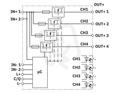 Vícekanálový, elektronický přístrojový jistič s rozhraním IO-Link na ochranu čtyř spotřebičů s 24 V DC při přetížení a zkratu. S elektronickým zajištěním nastavených jmenovitých proudů. Pro instalaci na DIN nosné lišty.