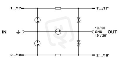 Konektor LSA-PLUS (COMTRAB CT 10) s hrubou/jemnou přepěťovou ochranou a odporem odpojení pro 18 signálních vedení - GND a hrubá ochrana GND - PE. Jmenovité napětí: 24 V DC. Provedení: 10 dvojvodičů