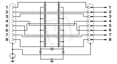 Jemná přepěťová ochrana podle třídy D (CAT.5e), pro Token Ring a Ethernet. Zásuvkové mezikusy RJ45 se samostatným uzemňovacím vedením, vč. kabelu RJ45