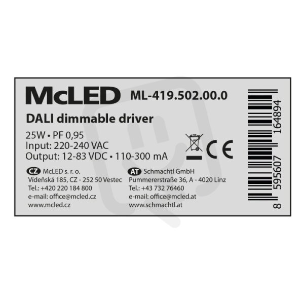 DALI stmívatelný driver 25W, PF 0,95, vý najdete v kategoriích LED driver, Příslušenství pro svítidla, Svítidla, Svítidla, světelné zdroje a LED osvětlení, EAN 8595607164894, kód dodavatele ML-419.502.00.0. DALI stmívatelný driver 25W, PF 0,95, vý nabízíme od 1 ks. Kód EMAS DALI stmívatelný driver 25W, PF 0,95, vý je ELSVOS1955699.
