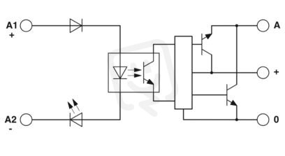Vstupní elektronické relé, s výstupem stejnosměrného napětí v protitaktu, přenosový kmitočet 100 kHz, se světelnou indikací a s ochranným zapojením ve vstupním a výstupním obvodu, vstup: 5 V DC, výstup: 14 - 30 V DC/50 mA