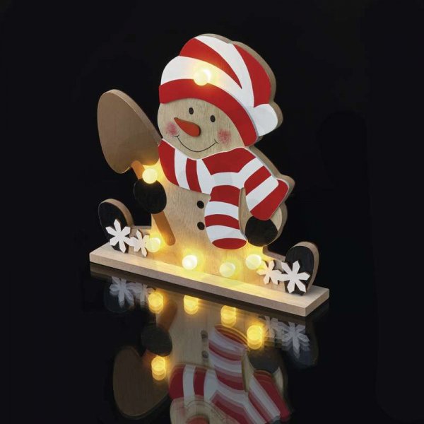 LED vánoční sněhulák dřevěný, 25cm, 2xAA, teplá bílá, časovač