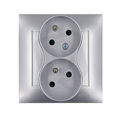 Zásuvka dvojnásobná s uzemněním, pootočená 16A, 250V, s clonkami, stříbrná matná