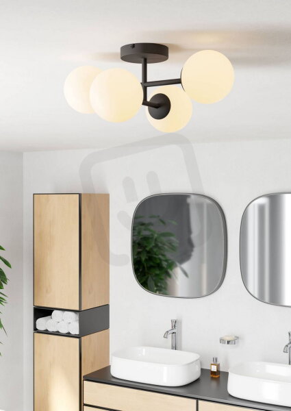 Se svou harmonickou kompozicí ze čtyř kulatých světelných těles přináší stropní svítidlo CASTROVIDO do koupelny měkké světlo a moderní eleganci. Opálově matné skleněné koule jsou umístěny na filigránové konstrukci z matné černé oceli – napínavý kontrast s moderním charakterem. Satinovaný povrch skla rozptyluje světlo rovnoměrně a bez oslnění. Díky krytí IP44 je svítidlo ideální pro vlhké prostory, jako je koupelna nebo prádelna. Vybaveno paticemi G9, umožňuje individuální výběr vhodných světelných zdrojů a jejich výměnu podle potřeby. CASTROVIDO zaujme svým jednoduchým, funkčním designem a nabízí dekorativní světelné řešení s vysokou každodenní použitelností.