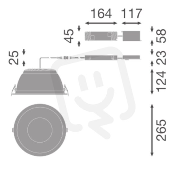 Výbava/příslušenství: Přiloženo je bezpečnostní lanko pro svítidlo. Včetně externího předřadníku. Včetně připojovací krabice s 5 pólovou svorkovnicí. Rámy pro povrchovou montáž jsou k dispozici pouze pro verze DALI D200 a D250. Šedé a černé vyměnitelné kroužky k dispozici jako samostatné příslušenství. Prodlužovací kroužky dostupné jako samostatné příslušenství. Prodlužovací kroužek D190 pro retrofit svítidla D150, prodlužovací kroužek D240 pro retrofit svítidla D200.