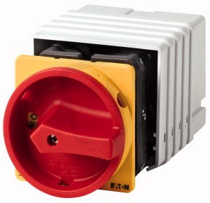 Nestandardní spínač, T5B, 63 A, Montáž do panelu, 5 Modul(y), Funkce nouzového vypnutí, S červenou otočnou ovládací pákou a žlutou objímkou