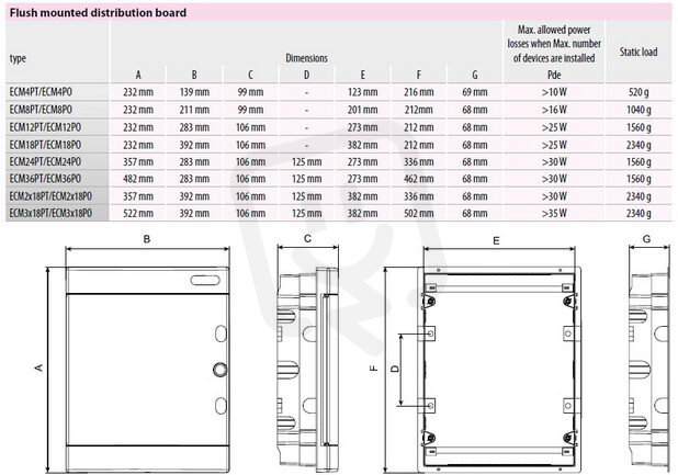 Zapuštěná rozvodnice s bílými dvířky ECM24PO, počet modulů: 24 (2x12), In = 63A, Un = 400V AC, stupeň krytí IP40, svorkovnice 13 PE / 13 N