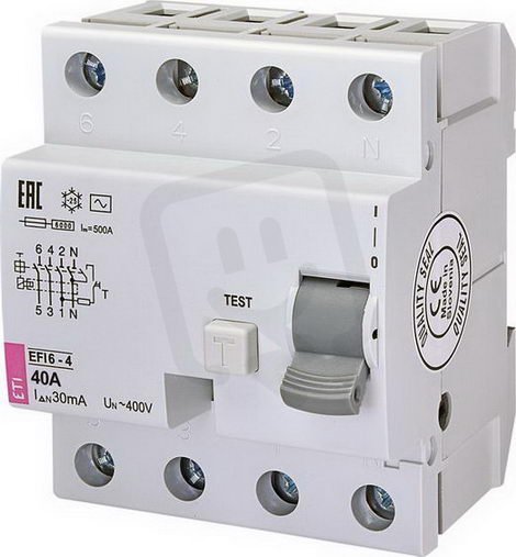 proudový chránič, EFI6-4 AC 40/0.03, Počet pólů 4, Skupina katalogu EFI-4 A, AC typy A a AC, Funkce RCCB, Jmenovitý proud (A) 40, Jmenovitý reziduální proud (A) 0.03, Un (V) 400, Typ AC