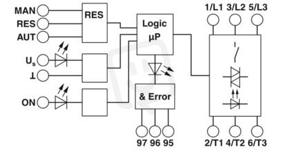 Hybridní spouštěč motoru; funkce: Startování motoru, Ochrana motoru (třída 10A); vstup: 24 V DC; výstup: 3~, 500 V AC, 9 A; Šroubové připojení