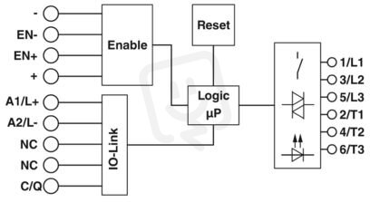 Do sítě zapojitelný hybridní spouštěč motoru k reverzování 3~ střídavých motorů do 500 V AC a výstupní proud 3 A, s nastavitelnou ochranou při přetížení, funkce nouzového zastavení do SIL 3/ PL e a přípojka push-in. Připojení k IO-Link.