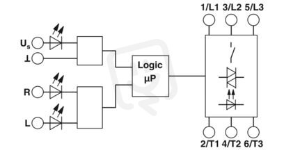 Hybridní spouštěč motoru k reverzaci 3~ AC motorů do 500 V AC a výstupní proud 9 A, s řídicím napětím 24 V DC a šroubovým přípojením.