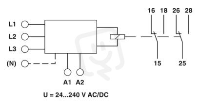 Dohledové relé pro dohled 3fázových napětí 280...520 V AC, podpětí, Window, sledu fází, výpadku fází, asymetrie, síťový napáječ se širokým rozsahem, 2 přepínače