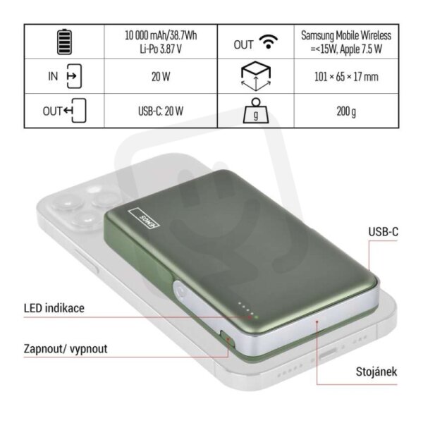 Powerbanka EMOS WI 1031, 10 000 mAh, 20 W+Wireless, army-green EMOS B0552AG