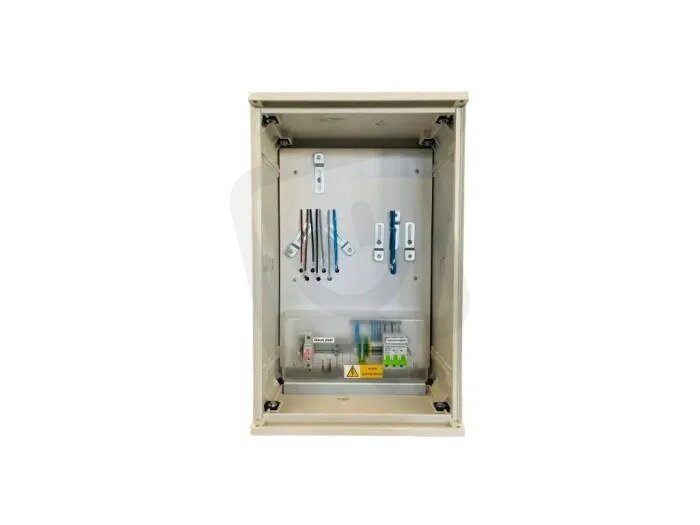 Skříně jsou vyrobeny v celoplastovém provedení z termosetu z SMC-prepreg materiálu, který je odolný proti povětrnostním vlivům, vodě a UV zářením. Prodloužení životnosti je navíc zajištěno UV ochranným nástřikem v barevném odstínu RAL7035. Materiál nepodléhá korozi, zachovává tvar, je nesnadno hořlavý kategorie B a samozhášivý. Vnitřní výzbroj jednosazbová/dvousazbová slouží pro měření spotřeby el. energie. Obsahuje nastavitelný držák elektroměru a HDO, jistič přijímače HDO-2B1,svorkovnice PEN, vypínač 63A 3P pro vývod max.16mm2, plombovatelný kryt a místo pro hlavní jistič. Silové vodiče jsou jednotné o průřezu 6mm2 pro osazení hlavního třífázového jističe do 40A. Hlavní jistič není součástí. Závěr rozváděčů je 3-bodový na trnový klíč 6 x 6 mm dle ČSN 359756.