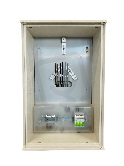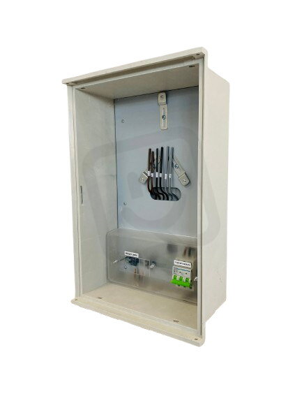 Skříně jsou vyrobeny v celoplastovém provedení z termosetu z SMC-prepreg materiálu, který je odolný proti povětrnostním vlivům, vodě a UV zářením. Prodloužení životnosti je navíc zajištěno UV ochranným nástřikem v barevném odstínu RAL7035. Materiál nepodléhá korozi, zachovává tvar, je nesnadno hořlavý kategorie B a samozhášivý. Vnitřní výzbroj jednosazbová/dvousazbová slouží pro měření spotřeby el. energie. Obsahuje nastavitelný držák elektroměru, vypínač 100A 3P pro vývod max.16mm2, plombovatelný kryt a místo pro hlavní jistič. Silové vodiče jsou jednotné o průřezu 16mm2 pro osazení hlavního třífázového jističe do 80A. Hlavní jistič není součástí. Závěr rozváděčů je 1-bodový na trnový klíč 6 x 6 mm dle ČSN 359756.