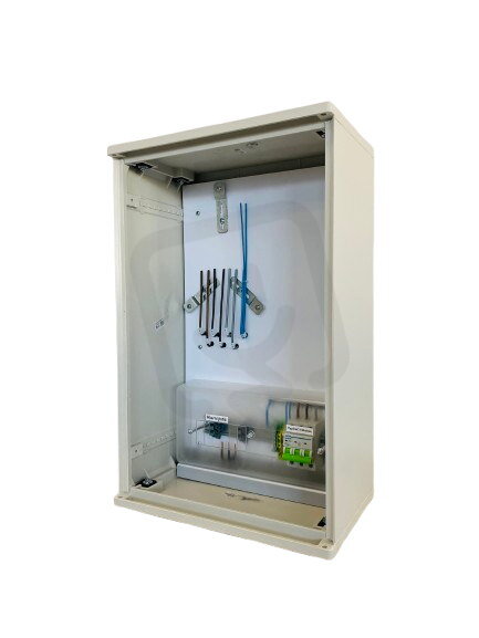 Skříně jsou vyrobeny v celoplastovém provedení z termosetu z SMC-prepreg materiálu, který je odolný proti povětrnostním vlivům, vodě a UV zářením. Prodloužení životnosti je navíc zajištěno UV ochranným nástřikem v barevném odstínu RAL7035. Materiál nepodléhá korozi, zachovává tvar, je nesnadno hořlavý kategorie B a samozhášivý. Vnitřní výzbroj jednosazbová/dvousazbová slouží pro měření spotřeby el. energie. Obsahuje nastavitelný držák elektroměru, svorkovnice PEN, vypínač 63A 3P pro vývod max.16mm2, plombovatelný kryt a místo pro hlavní jistič. Silové vodiče jsou jednotné o průřezu 6mm2 pro osazení hlavního třífázového jističe do 40A. Hlavní jistič není součástí. Závěr rozváděčů je 3-bodový na trnový klíč 6 x 6 mm dle ČSN 359756.
