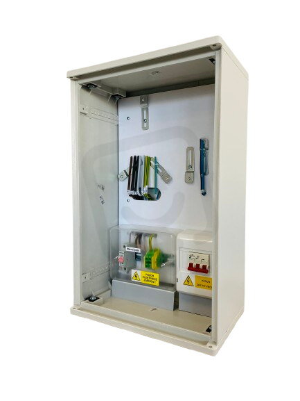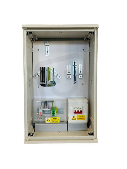 Skříně jsou vyrobeny v celoplastovém provedení z termosetu z SMC-prepreg materiálu, který je odolný proti povětrnostním vlivům, vodě a UV zářením. Prodloužení životnosti je navíc zajištěno UV ochranným nástřikem v barevném odstínu RAL7035. Materiál nepodléhá korozi, zachovává tvar, je nesnadno hořlavý kategorie B a samozhášivý. Vnitřní výzbroj jednosazbová/dvousazbová slouží pro měření spotřeby el. energie. Obsahuje nastavitelný držák elektroměru, vypínač 100A 3P pro vývod max.16mm2, plombovatelný kryt a místo pro hlavní jistič. Silové vodiče jsou jednotné o průřezu 16mm2 pro osazení hlavního třífázového jističe do 80A. Hlavní jistič není součástí. Závěr rozváděčů je 1-bodový na trnový klíč 6 x 6 mm dle ČSN 359756.