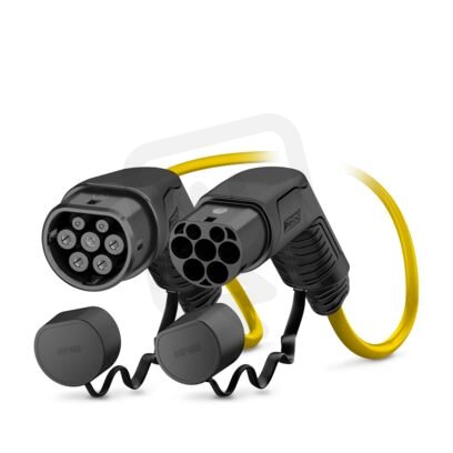 CHARX connect comfort, Typ 2, Mobilní nabíjecí kabel AC, 20 A trvale, 480 V AC, s nabíjecím konektorem automobilu a nabíjecím konektorem infrastruktury, kabel: 5 m, žlutá, přímý, s ochranným víkem bez loga, Volný prostor pro nálepku s logem, IEC 62196-2, k nabíjení elektromobilů (EV) střídavým proudem (AC) s nabíjecí zásuvkou elektromobilu typu 2