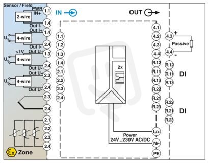 Ex i, Procesní indikátor, multifunkční, ve vestavném pouzdru do rozvaděče pro dohled a zobrazení analogových měřených hodnot. Univerzální vstupy umožňují připojení proudu, napětí, RTD a TC. 2 výstupy reléového přepínače a 1 analogový výstup.. HART