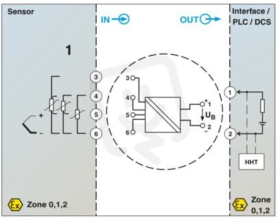 Ex i-Převodník na hlavici napájený z výstupní smyčky k přenosu signálů snímačů odporového teploměru a TC a snímačů odporu a napětí prostřednictvím 4 mA ... 20 mA. HART, Standardní konfigurace, Šroubové připojení