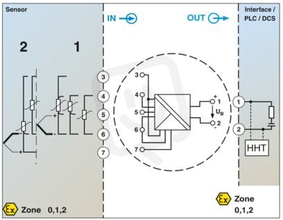 Ex i-Převodník na hlavici napájený z výstupní smyčky k přenosu až 2 signálů snímačů odporového teploměru a TC a snímačů odporu a napětí prostřednictvím 4 mA ... 20 mA. HART, Standardní konfigurace, Safety Integrity Level (SIL, IEC 61508): 2, Systematic Capability: 3, Šroubové připojení