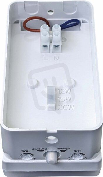 Při instalaci je možnost pomocí přepínače integrovaného pod krytkou svorkovnice změnit výkon svítidla ve třech stupních (12/15/20 W).
