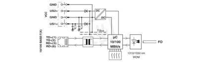 Optický konvertor (náhradní zařízení A), k plně duplexnímu přenosu z 10/100Base-T(X) na jednotlivá skleněná vlákna simplex s technologií WDM (Wavelength Division Multiplex), optická přípojka SC simplex (1310/1550 nm). Pro provoz potřebný set zařízení (typ A a typ B)!