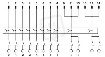 Předávací modul, přípojka 1: IDC/FLK lišta s trny 1x 14-pólový, přípojka 2: Šroubová svorka s nožovým rozpojovačem 12-pólový, přípojka 3: Zkušební zásuvka 10-pólový, počet kanálů: 8, řídicí logika: kladně spínající