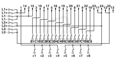 Předávací modul, přípojka 1: Zdířkový konektor D-SUB 1x 25-pólový, přípojka 2: Šroubová svorka s nožovým rozpojovačem 32-pólový, přípojka 3: Zkušební zásuvka 24-pólový, počet kanálů: 2, řídicí logika: kladně spínající