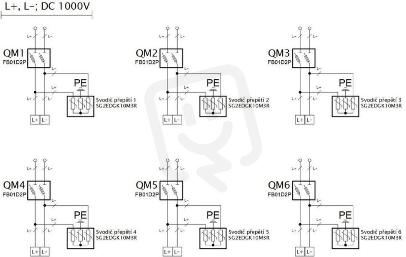 Fotovoltaická rozvodnice FAMATEL SolarBOX fr032L IP65 chránící DC vedení o max. napětí 1000V, pro šest stringů. Osazena jistícími a ochrannými prvky: 6 x pojistkový odpojovač LOVATO 1000V DC, 2P 10x38, bez pojistek, 6 x svodič přepětí LOVATO 1100V DC typ I+II, použité pouzdro: 39421 - 565x325x150mm, barva: světle šedá.