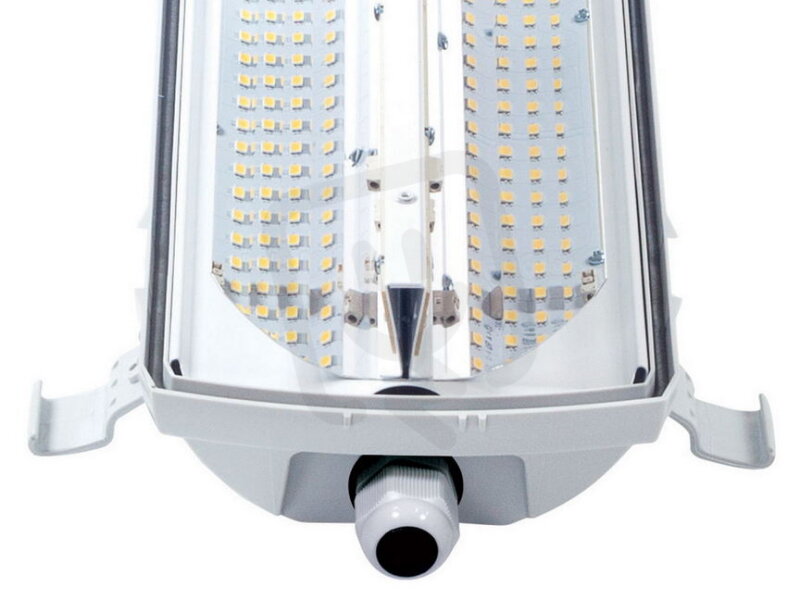 Plastové průmyslové LED svítidlo vhodné pro regálové uličky s vysokými stropy, s difuzorem z translucentního polykarbonátu.