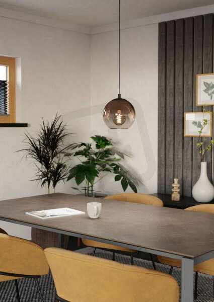 Závěsné svítidlo ARISCANI 1 spojuje moderní estetiku s teplým světlem. Kulovitý skleněný stínidlo v měděně průhledném provedení vytváří elegantní akcent – zejména díky přechodu od čirého skla k metalicky lesklému tónu. Tento rafinovaný barevný efekt vytváří příjemné světelné působení, při kterém je zdroj světla jemně tlumený a přitom dobře viditelný. Minimalistický černý baldachýn tvoří výrazný kontrast ke sklu a zdůrazňuje současný design. Díky patici E27 je svítidlo flexibilně kombinovatelné s různými zdroji světla – obzvláště efektní je s dekorativními vláknovými žárovkami. ARISCANI 1 je ideální pro samostatnou instalaci nad odkládacími stolky nebo jako řada nad dlouhými jídelními stoly a pulty.