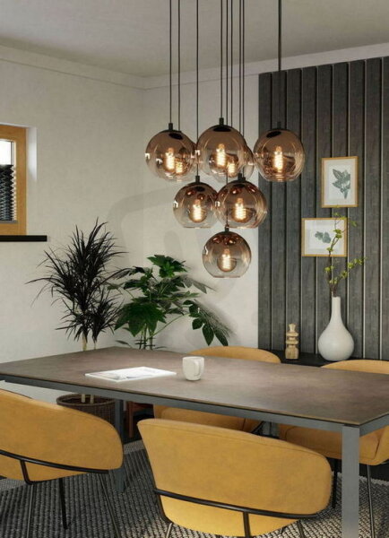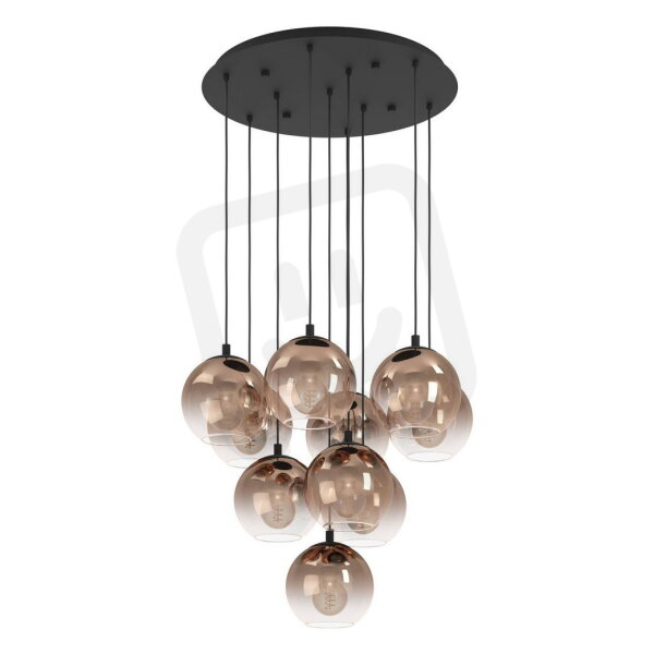 Závěsné svítidlo ARISCANI 1 se představuje jako moderní designový objekt s dekorativním charakterem. Deset kouřových stínidel z průhledného skla s měděným leskem visí v různých výškách z kulatého černého baldachýnu. Usazení do shluku vytváří harmonický celek a dodává svítidlu zvláštní prostorový efekt – ideální pro otevřené obytné prostory, vysoké stropy nebo prostorné vstupní haly. Elegantní kombinace černé a mědi působí současně moderně a teple. Díky otevřenému designu jsou dekorativní žárovky E27 s vláknem obzvlášť vhodné pro stylové doplnění svítidla. Žárovky nejsou součástí balení.