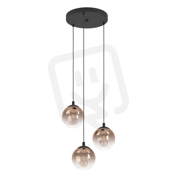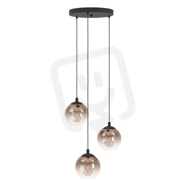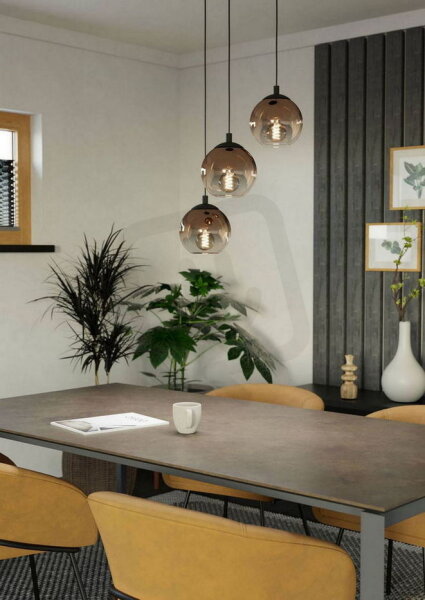 Svojí neobvyklou formou a vysoce kvalitním výběrem materiálů se závěsné svítidlo ARISCANI 1 stává poutačem pohledů v každé místnosti. Tři koule tvarované stínidla z měděně průhledného skla visí v různých výškách z kulaté černé stropní základny. Světlo je měkké a rovnoměrně rozptýlené, přičemž průhledné zabarvení skel vytváří příjemně teplou atmosféru. Kombinace černé a mědi působí moderně a zároveň elegantně – ideální pro stylové jídelny, obývací pokoje nebo otevřené kuchyně. Svítidlo je vhodné pro tři žárovky E27, které nejsou součástí dodávky. Zejména dekorativní filamentové žárovky zde vyniknou.
