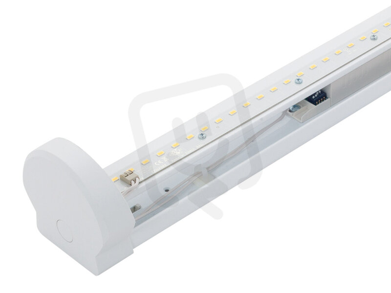 Řadové plastové interiérové LED svítidlo na přisazení ke stropu nebo na stěnu se základnou z ocelového plechu a difuzorem z translucentního polykarbonátu.