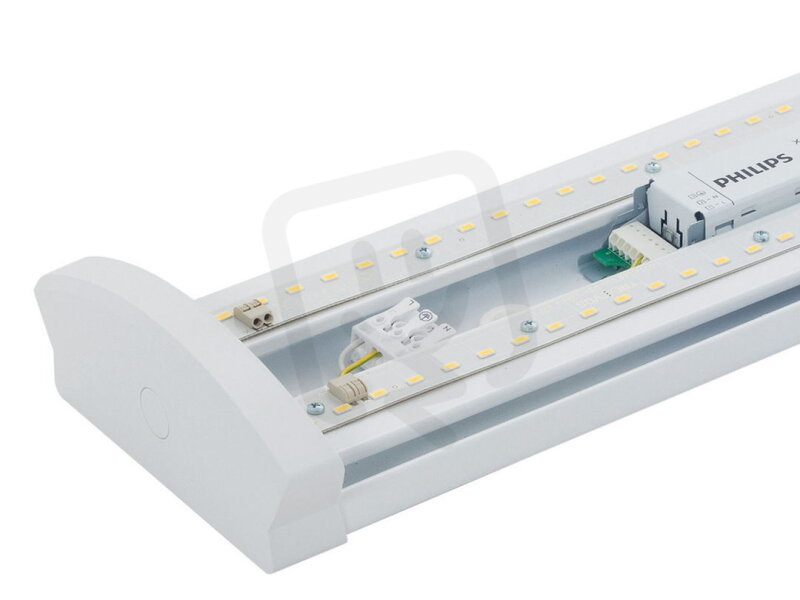 Řadové plastové interiérové LED svítidlo na přisazení ke stropu nebo na stěnu se základnou z ocelového plechu a difuzorem z translucentního polykarbonátu.