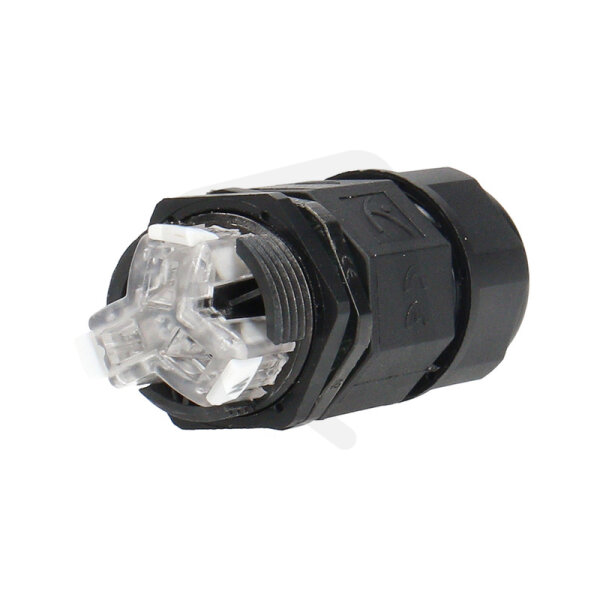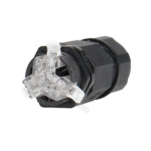 Kabelová přívodka rovná, IP68, měděné poniklované kontakty, připojení páčkami se značením: "+", "W", "Y", 3piny. Rozměry přívodky: délka cca 65mm x průměr 25mm, otvor průměr 21mm, max.16A/250V, pro průměry kabelu 6,5 - 11mm, max. průřez 2,5mm2.