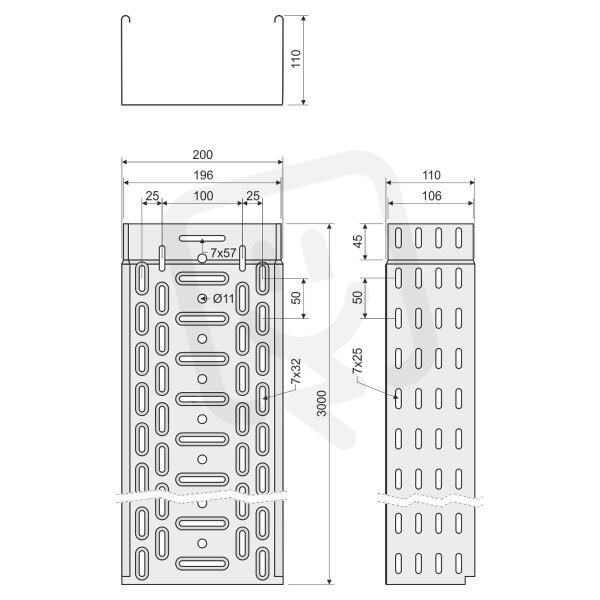 Kabelový žlab s integrovanou spojkou KZI 110x200 z plechu tloušťky 0,75 mm v povrchové úpravě sendzimir, děrovaný, opatřený embosy pro zvýšení pevnosti a tuhosti.